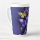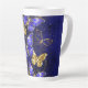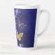 Composición de lujosas mariposas de zafiro y joyas de oro sobre fondo de textura azul.