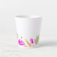 Esta taza muestra en su borde inferior un grupo de cuchillas y flores de color beige, magenta, rojo y naranja sobre el fondo blanco.