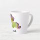 Una taza de café con leche con una imagen de unicornio de estilo Frankenstein. Colores púrpura y verde. Qué lindo.
