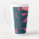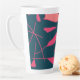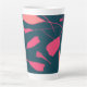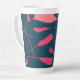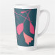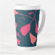 Esta taza muestra una mano artística expresiva dibujada a la luz natural y pétalos rosados oscuros esparcidos en una superficie negra.