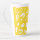 Esta taza exhibe diferentes formas de manchas blancas y líneas circulares que simbolizan granos de café sobre una superficie naranja amarillenta. El ilustracion está dibujado a mano.