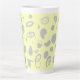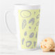 Esta taza exhibe diferentes formas de manchas de lavanda y líneas circulares que simbolizan granos de café sobre una superficie amarillenta y blanca. El ilustracion está dibujado a mano.