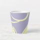 Esta moderna taza ofrece un diseño expresivo a mano compuesto por líneas amarillas blancas que atraviesan la superficie lila plana.