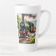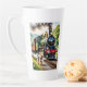 A nostalgic scene of a dog greeting the arrival of a green steam train.
