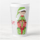 Alfombras de chocolate dulce o caliente para niños de todas las edades. Se balbuceó con traje verde en una pila de regalos de Navidad. Fondo gris con texto en personalizable escrito a mano