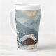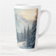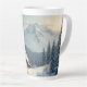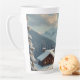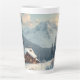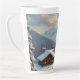 Escena de invierno de inspiración alpina con un acogedor chalé rodeado de árboles cubiertos de nieve y majestuosas montañas. Perfecto para la decoración rústica, el arte de temporada y la inspiración de las vacaciones.