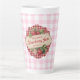 Sello tipo vintage de fresa, delicioso, delicioso, con cheques rosados y blancos.