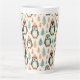 Una taza de café Navidad con pingüinos y pinos adorables en rojo ladrillo, dorado y turquesa.