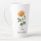 Flor de mes de nacimiento Noviembre Mug de latte de crisantemo con un ilustracion de una flor de crisantemo. Debajo de la flor, el nombre está escrito en una elegante fuente de escritura. Debajo del nombre, se indica "Noviembre - Crisantemo" indicando que el mes de nacimiento de la dueña es noviembre y su flor de nacimiento es el crisantemo. Es una taza personalizada, personalizada como un regalo para alguien nacido en noviembre.