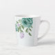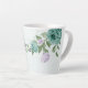 flores azules moradas románticas con algunas hojas verdes taza de latte botánico.