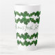 Sombrero verde alto latté mug con personalización. Filas de trébol verde alrededor de la taza, con espacio en el centro para decir algo corto. El texto de la muestra dice: "Latté irlandés de Maureen". Personaliza con un nombre usando un tipo de letra moderno escrito a mano en verde oscuro.