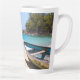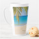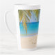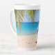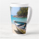 Una taza de café con leche y una playa tropical idílica. Agua azul turquesa cristalina y una playa de arena fina de color marrón. Algunas hojas de palmera cuelgan desde arriba. En la playa hay una vieja barca de madera. Un paisaje tranquilo y sereno.