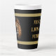 Jesús León de Judá con la cabeza de león Latte Mug sobre un fondo dorado y negro. Grabación de oro y tiras que enmarcan la fuerte cabeza de los Leones dándole a esta taza una cualidad de fuerza y autoridad.