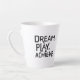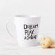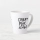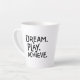 Diseño de una taza con la frase "Sueño". Jugar. Lograr" en colores audaces y contrastantes. Las cartas están dispuestas en un patrón dinámico y ascendente, lo que sugiere impulso y crecimiento. El diseño general es enérgico e inspirador.