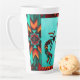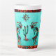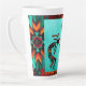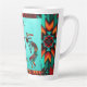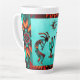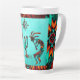¡Este es un "uno de bondad" único en el suroeste de Kokopelli Latte Mug! Cuenta con dos Kokopelli del Suroeste en Turquesa, Naranja y Negro jugando a la flauta y bailando alrededor de un cactus bajo el sol...sobre un fondo turquesa. Diseño De Arte Original Del Artista Kerry Miller.
