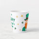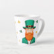 Leprechaun Clover Shamrock Patrick's Day Latte Mug. Una taza festiva temática del Día de San Patricio con un ilustracion de un hombre alegre. El hombre usa un gorra verde con una banda negra y una hebilla de oro y tiene una barba roja brillante. Su cara tiene una expresión amistosa con una sonrisa. La taza está rodeada de rocas de champú verdes y naranjas.