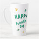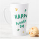 Leprechaun Clover Shamrock Patrick's Day Latte Mug. Una taza festiva temática del Día de San Patricio con un ilustracion de un hombre alegre. El hombre usa un gorra verde con una banda negra y una hebilla de oro y tiene una barba roja brillante. Su cara tiene una expresión amistosa con una sonrisa. La taza está rodeada de rocas de champú verdes y naranjas.