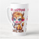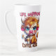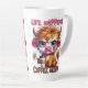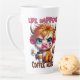 A funny and sarcastic design showcases a cute highland cow sitting with a beautiful white daisy and a to-go coffee cup. The cow, with big blue eyes and a serious expression, sports a lipstick kiss on his cheek and vibrant orange-and-white fur. The colorful text reads, "Life happens, coffee helps." This design is available on various products, making perfect gifts for coffee lovers.