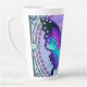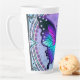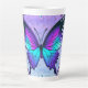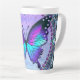 Una mariposa vibrante con tonos azules y violetas se centra en un diseño circular ornamentado, rodeado de intrincados motivos florales y joyas decorativas. La composición general se caracteriza por una estética de vidrio manchado con una mezcla armoniosa de colores y simetría.