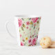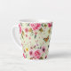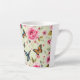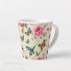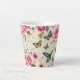 Tiene un fondo amarillo claro con mariposas, flores y rosas rosas.