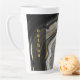 Gran taza de latte personalizada con diseño de mármol negro y dorado. La plantilla está configurada para que añada tu nombre, en tipografía audaz moderna, verticalmente abajo de un lado de la taza en un panel oscuro semiopaco.