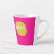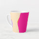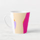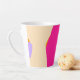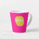 Esta taza muestra la palabra 'MOKA' en su centro verdoso. El fondo es magenta.
