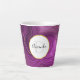 Una taza de café con leche con un diseño abstracto elegante. Color amatista morado oscuro con cintas de oro enclavadas entre estratos de capas. Diseño rico y hermoso. En la parte superior hay un marco de círculo blanco con un borde de Relieve metalizado de oro falso, con su monograma personalizado inicial y su nombre en el interior.