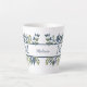 Le encantará esta taza de espresso personalizada de bonito que presenta un patrón de hojas azul y verde índigo e imágenes de helecho haciendo un borde para su monograma en el centro. El monograma y las imágenes se colocan sobre un fondo blanco. Su monograma se repite en dos lados del vaso, con su nombre u otro texto en el centro entre los monogramas.