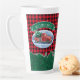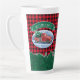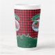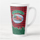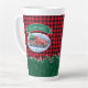 Bebe tu café con estilo con esta taza de café con leche temática. Este diseño presenta una camioneta roja vintage que lleva un árbol de Navidad en una escena nevada. Arriba hay un banner verde con tu nombre para personalizar. El fondo es de búfalo rojo y negro, recubierto de una hilera de pinos en la parte inferior. Diseñado por el artista de renombre mundial ©Tim Coffey.