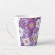 Esta taza de café con leche tiene flores y hojas en tonos morados, magenta, amarillos y blancos sobre un fondo morado.