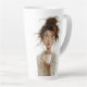 La imagen representa un caprichoso y exagerado ilustracion al estilo personalizado de una mujer con ojos amplios, sobresaltados, cabello melindroso en un moño desordenado y pecas. Parece deslucida y confusa, sosteniendo una taza de café blanca en ambas manos mientras usa una bata ligera con un patrón floral. Su expresión sugiere que está sorprendida o abrumada, posiblemente después de despertarse o de experimentar un momento caótico. Los rasgos exagerados, especialmente sus ojos grandes y su cara delgada y expresiva, le dan un tono humorístico y afectuoso a la escena.