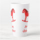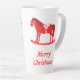 Este impresionante Navidad latte mug presenta una imagen de arte digital de un lindo caballo mecedor al estilo escandinavo. El caballo es rojo con un mané rojo oscuro, cola y pezuñas. El caballo amistoso sonríe. Tiene una silla blanca y riendas con motivos folclóricos escandinavos bonitos en la silla, incluyendo el sol, la luna y las estrellas y los corazones y flores. La base del mecedor es roja y está cubierta de hojas blancas de bonito. El diseño se inspiró en el caballo Dala sueco. Hay texto personalizado para que puedas personalizar este diseño con tu propio mensaje.