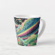 This latte mug features a sleek black crow—the eternal messenger—perched among desert blooms beneath a radiant, otherworldly night sky. Rainbow clouds arc toward distant planets, blurring the line between myth and science fiction.