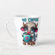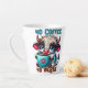 A funny and sarcastic design features a cute highland cow sitting with a steaming coffee mug that has a lipstick kiss mark on the front. The cow, with big blue eyes, glasses, and a soft expression, has black and white fur. Bright, colorful text reads: "No coffee, no workie." This playful design is available on various products, making perfect gifts for coffee lovers.