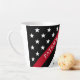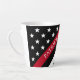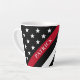 Muestra tu apoyo con esta delgada alfombra roja de la bandera del bombero latte mug. Este diseño presenta una bandera de bomberos en blanco y negro con una fina línea roja en un ángulo y un nombre que puede personalizar. Diseñado por la artista de renombre mundial ©Tim Coffey.