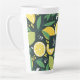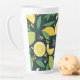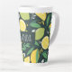 Latte mug con un lindo patrón de limones amarillos y fruta de cal verde con tallos de hojas sobre un fondo verde oscuro.