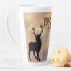 Deer hunter latte mug con plantilla de nombre. El diseño de bosques con imágenes de ciervos y fondo forestal rodea esta gran taza. Los colores son marrón, marrón, gris y negro con un nombre en texto impreso en gris en la parte superior izquierda del diseño. Hace un buen regalo para un hombre que disfruta cazando.