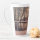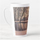 Taza De Café Latte Puesta de sol sobre el parque con un pequeño lago