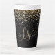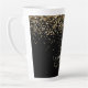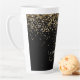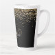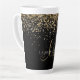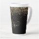 Purpurina Glam Gold Elegant Monograma Latte Mug. Personaliza fácilmente este diseño de tazas de latte de moda de moda con un elegante purpurina brillante de oro sobre un fondo negro. El diseño incluye su monograma manuscrito con remolques de bonito y su nombre.