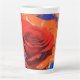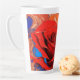El tazón de latte alto artístico presenta un rosa digital abstracto digital digital de alta intensidad, marcado rojo y naranja, con un fondo azul.