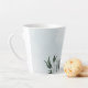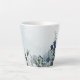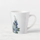 Hermosa taza de latte botánico con flores blancas románticas, azul claro polvoriento y azul marino con hojas verdes.
