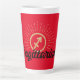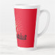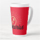La taza de latte con temática zodiaca presenta un símbolo de astrología Sagittarius acentuado con estallido de oro con texto negro sobre fondo rojo