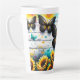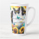 Este atraso presenta un diseño vibrante y encantador que capta la belleza de la naturaleza. Las obras de arte muestran mariposas grandes y detalladas con alas negras y amarillas, flameando con gracia contra un fondo de alambre de púas y salpicaduras de pintura colorida. Abajo, florece un campo de girasoles brillantes y alegres, que le dan un toque de calidez y alegría. Las mariposas más pequeñas, en tonos verde azulados y amarillos, le dan un encanto excepcional al lugar. Esta taza es perfecta para darle un toque de serenidad a su café o té matutino.