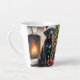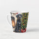 This beautiful latte mug shows a cozy, festive Christmas scene featuring a large black Great Dane lying in front of a glowing fireplace. The fire casts a warm light over the room, enhancing the dog’s glossy black coat. To the left of the fireplace stands a beautifully decorated Christmas tree adorned with red and gold baubles. Beneath the tree are several neatly wrapped presents, red and gold, that complete the holiday atmosphere. The overall tone is warm, homely, and peaceful—perfectly capturing the essence of a cosy Christmas evening. Can easily be personalised