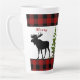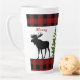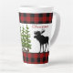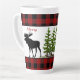 Esta taza de latte de estilo rústico presenta un diseño único de una silueta de alce sobre un fondo de cuadros rojos y negros. Agregué una superposición de abetos para darle a esta taza un aspecto invernal boscoso. Esta taza de latte sería un regalo de Navidad considerado