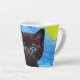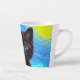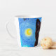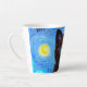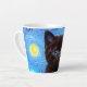 Latte Mug con un gato negro en la pintura Starry Night de Van Gogh! Este gatito de ojos azules mira adorablemente desde un fondo de remolinos azules y una brillante luna amarilla. ¡Un regalo fantástico para los amantes del gato y para los coleccionistas holandeses de arte!