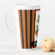 Bienvenidos a la temporada de otoño con este caprichoso tazón de latte con una acuarela ilustrada elfo de la cosecha de bosques / ninfa encaramado en grandes calabazas con fondo de rayas naranjas y negras y una tira de texto de personalizable en la parte inferior