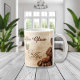 This charming coffee mug features a soft coffee-colored background, scattered coffee beans, a steaming cup of coffee, and the personalized phrase: