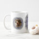 Two custom photos and your dog's name come together in this lavender watercolor mug. A subtle breed silhouette accents the verse: 'Lavender night holds tiny dreams in quiet wonder', creating a peaceful gift for pet parents.