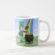The Leprechaun stands with a three-leaf clover in his hand next to a pot of gold at the end of the rainbow where he is ready to celebrate. St. Patrick's Day.